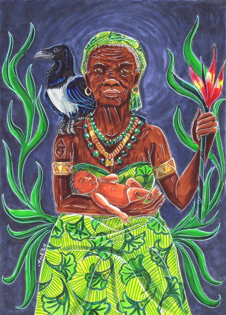 ella también es la madre de Anansi, el dios embaucador. Asase Yaa es muy poderosa, aunque no hay templos dedicados a Ella, sino que es adorada en los campos”.
