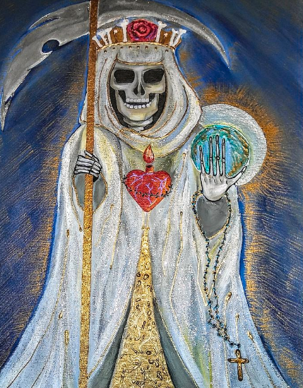 In the Latinx community, especially among migrants and border witches or liminal witches (brujas), La Santísima has been an icon that redefines issues of empowerment; She is a bridge that connects with the roots of Mexicanness and its imaginaries, with the power of the displaced and marginalized. There, on the other side of the Río Grande, far from the homeland, She has also arrived. The icon It has complexities and an implicit political discourse, «la flaca» is also associated with Mexican folk magic and apocryphal saints who do not need official recognition to help and «hacer un paro».