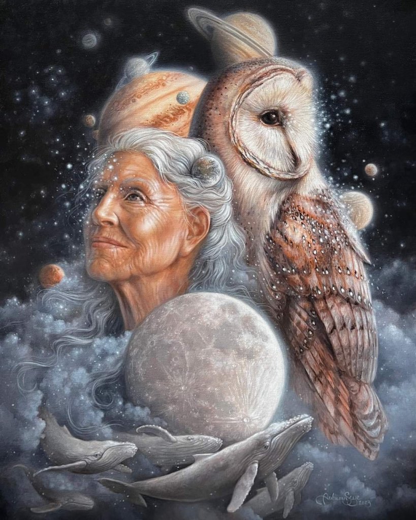 Ella es la puerta hacia la transformación, es la señora que nos espera para caminar mas allá de la niebla, porta la sabiduría de soltar, es un árbol otoñal que deja partir a las que fueron sus hojas; ella se está preparando para dormir en el frio del invierno. La Diosa Anciana es oscura y misteriosa, ella ya no sostiene la vida, ella es la cortadora de la vida, sabe que cosas tiene que vivir y cuales morir, de ahí su asociación a las artes visionaras, místicas y sanadoras.